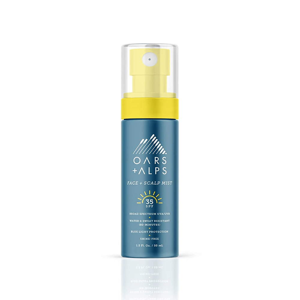 Oars + Alps Face & Scalp Mist is a quick, lightweight formula with both water and sweat resistance for long-lasting cover.