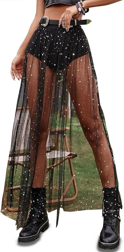 The sheer skirts have seen many music festival grounds layered overtop shorts, full high-waisted brief, or a thong. It's a look that passed the vibe of the event - free and flowy. But you can bring it into the everyday world by re-paneling the sheer with tights, leggings, or pants as you see fit. Going the opposite route, you can snag a snug, sheer skirt (short, midi, or long) and layer that with a bodycon skirt or denim shorts. Flowly or snug, both elevate any look as layering often does.